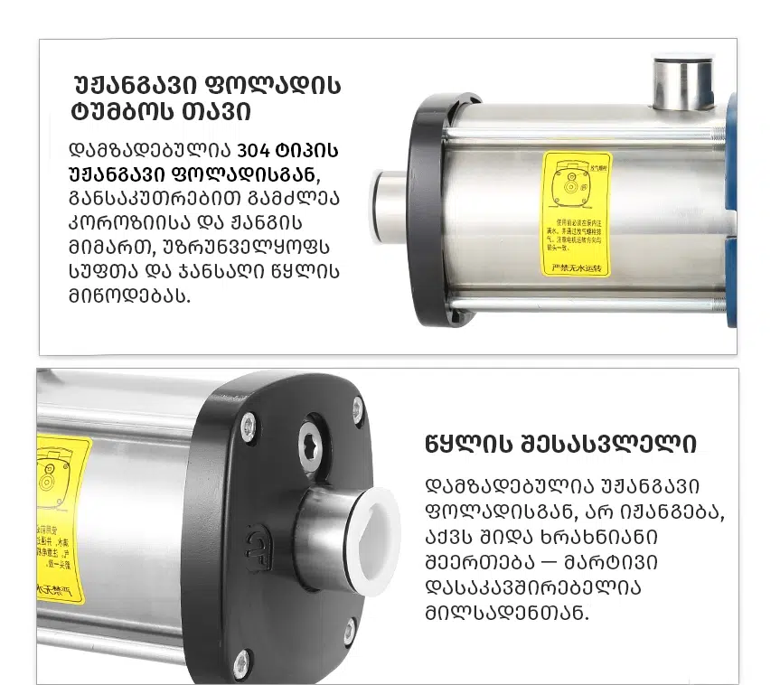 ტუმბოს შიგნით ჟანგისა და ნალექის წარმოქმნა სრულად გამორიცხულია, რაც უზრუნველყოფს სუფთა, გამჭვირვალე და ჰიგიენურ წყალს.