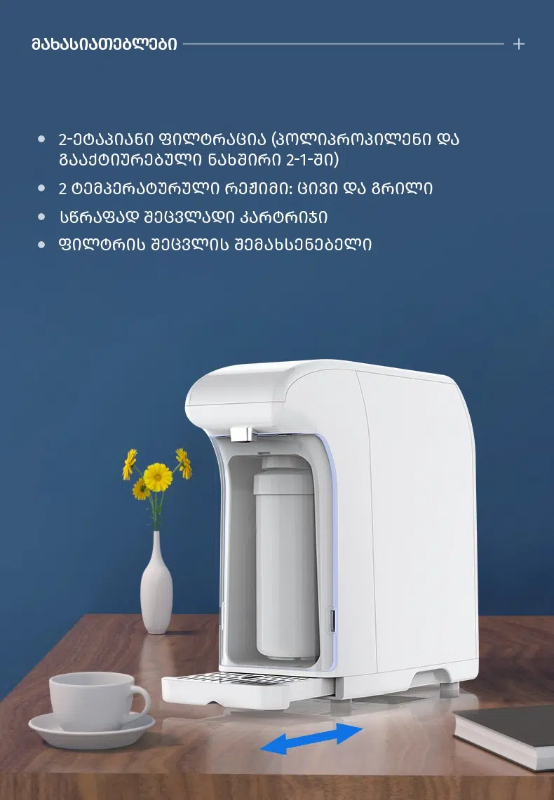 წყლის პურიფაიერი ცხელი და ცივი სასმელებისათვის ფილტრით - საოფისე, საყოფაცხოვრებო და სხვა მრავალი გამოყენებით.