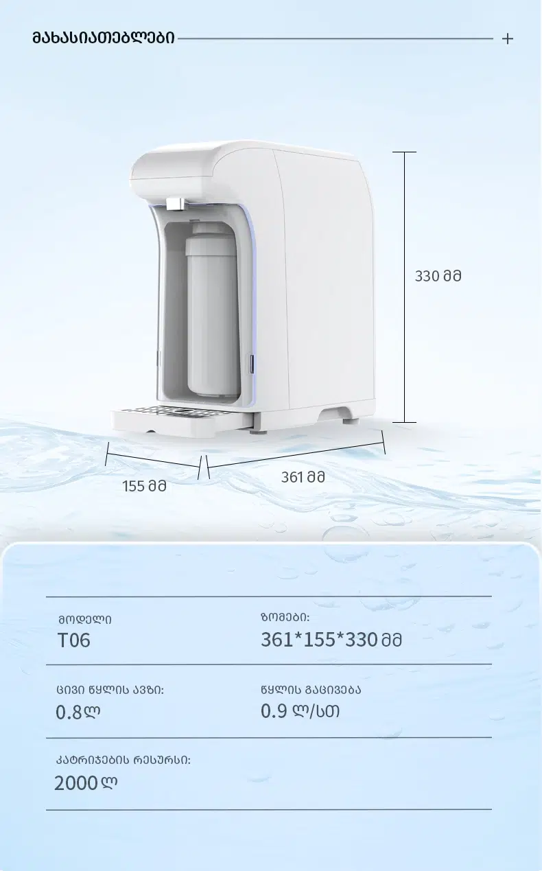 მაგიდის წყლის დისპენსერი — ჭკვიანი არჩევანი თანამედროვე სივრცისთვის მაგიდის წყლის დისპენსერი არის კომპაქტური, ფუნქციური და თანამედროვე მოწყობილობა, რომელიც იდეალურად ერგება როგორც საოფისე, ისე სახლის გარემოს. ის განკუთვნილია სუფთა, გაფილტრული წყლის მოსაპოვებლად იქ, სადაც სივრცე შეზღუდულია, ხოლო კომფორტი მნიშვნელოვანი.