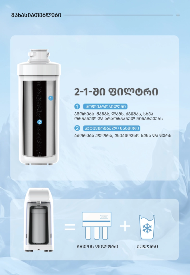 დისპენსერი აღჭურვილია 2-ეტაპიანი ფილტრაციით – პოლიპროპილენისა და მაღალი ხარისხის გააქტიურებული ნახშირის კომბინაციით (2-1-ში), რაც უზრუნველყოფს წყლის ეფექტურ გაწმენდას მავნე მინარევებისგან.