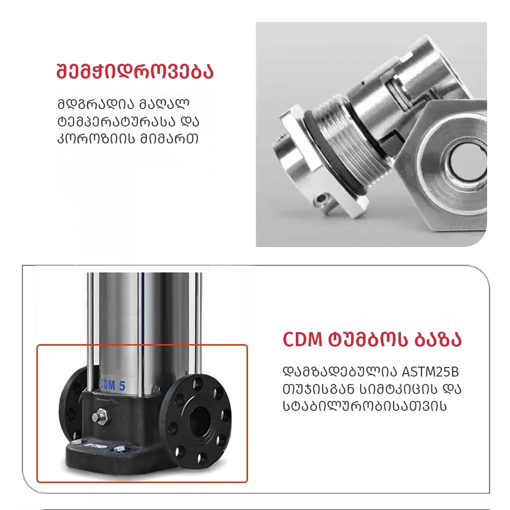 CDM სერია წარმოადგენს ახალი თაობის ვერტიკალურ მრავალშრიან ცენტრიდანულ ტუმბოს, რომელიც გამოირჩევა მაღალი ეფექტიანობით, შექმნილია ევროპული სტანდარტების მიხედვით.