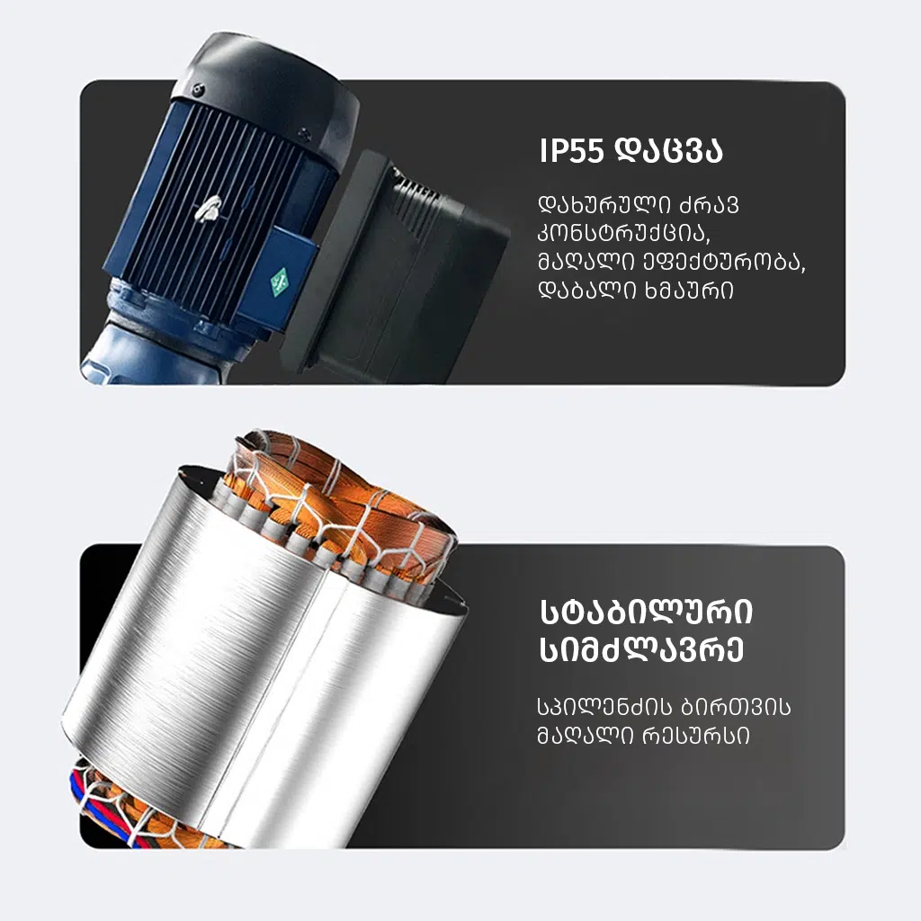 გადახურების საწინააღმდეგო დაცვა და ავარიული გათიშვა იცავს ძრავს დაზიანებისგან, სპილენძის გრაგნილები ხასიათდება დაბალი წინააღმდეგობით და მაღალი ენერგოეფექტურობით.